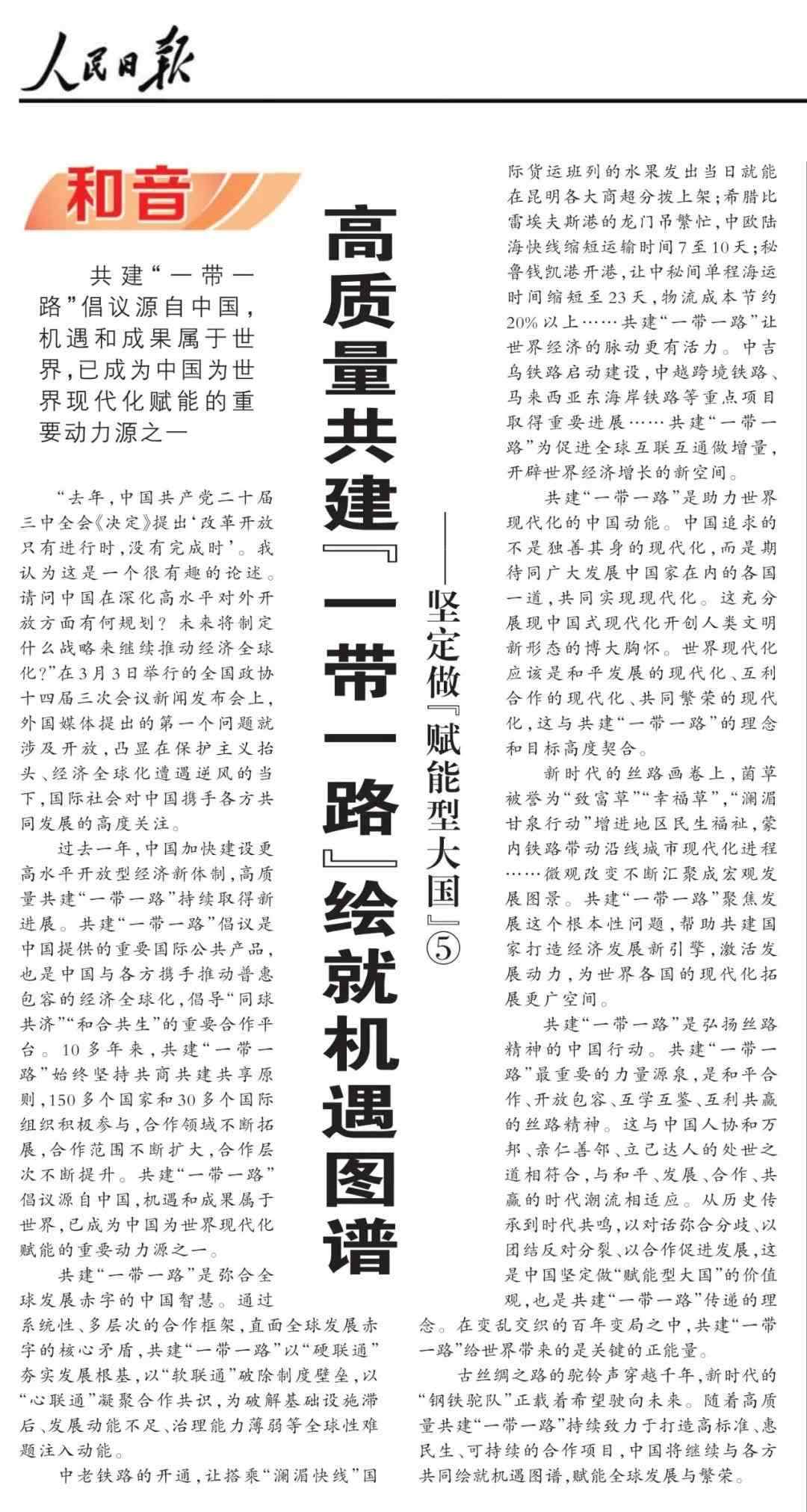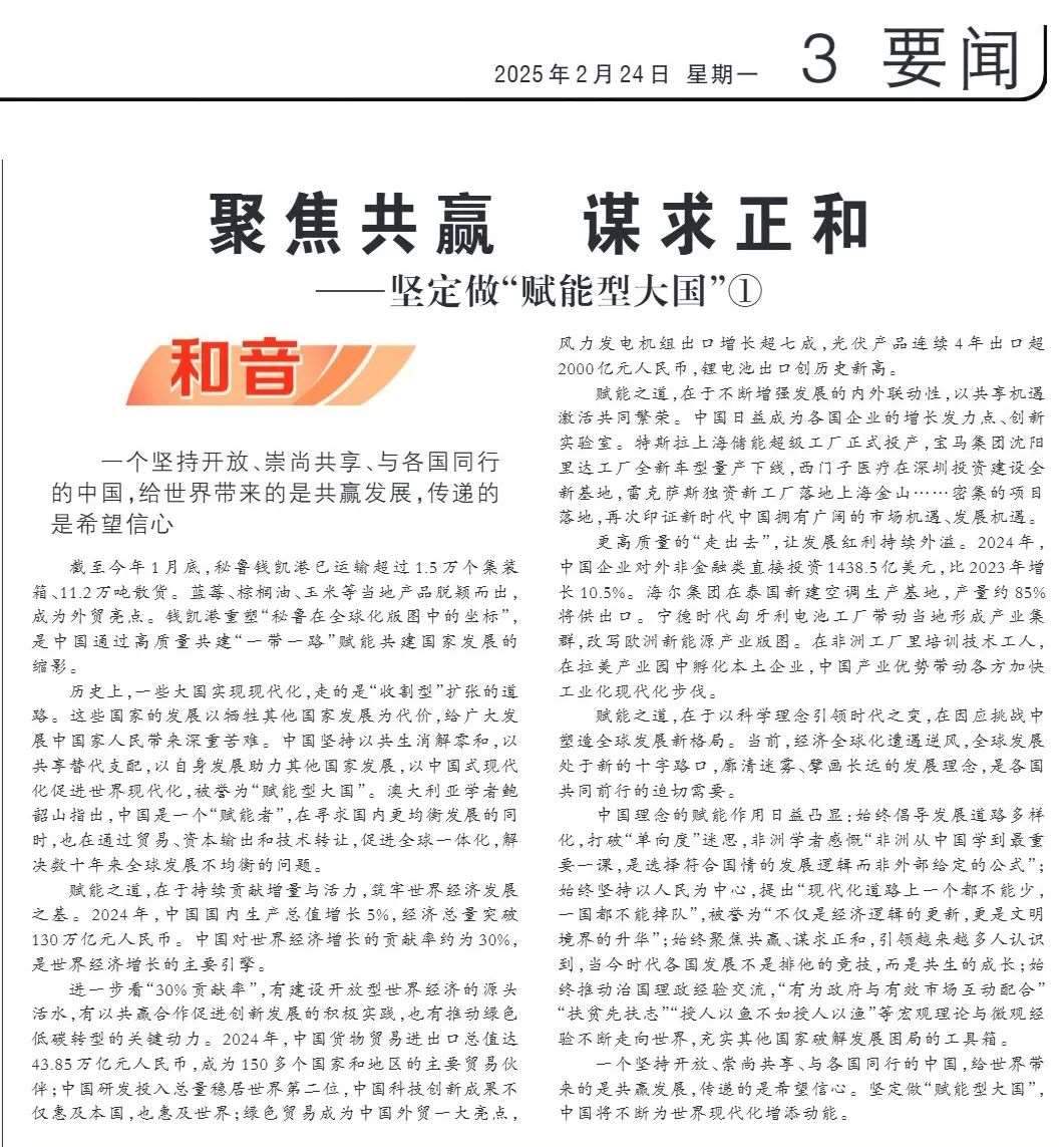 近期,《人民日報(bào)》“和音”欄目推出“堅(jiān)定做‘賦能型大國’”系列評論,圍繞科技創(chuàng)新、開放共贏、綠色轉(zhuǎn)型、高質(zhì)量共建“一帶一路”、多邊治理等熱點(diǎn)議題,從不同角度闡釋中國何以成為一個(gè)“賦能型大國”的深層邏輯,展現(xiàn)中國始終秉持構(gòu)建人類命運(yùn)共同體理念,不斷以中國式現(xiàn)代化為世界現(xiàn)代化賦能的大國擔(dān)當(dāng)。