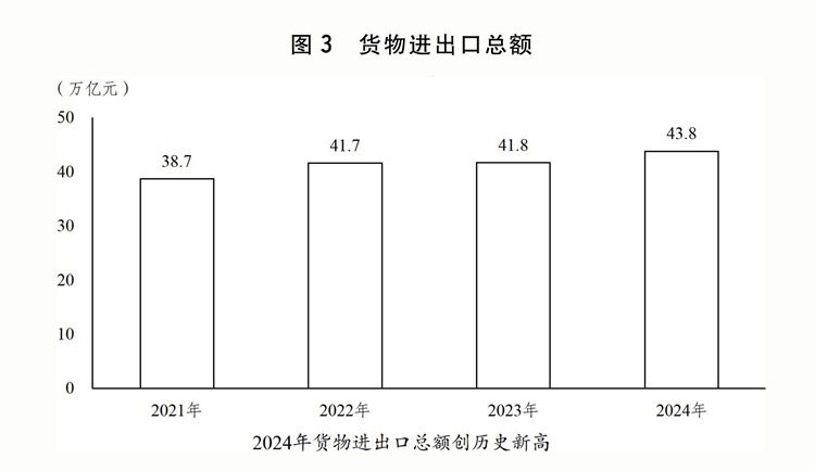 二是外貿(mào)出口對(duì)經(jīng)濟(jì)增長貢獻(xiàn)增大。出臺(tái)關(guān)于促進(jìn)外貿(mào)穩(wěn)定增長、拓展跨境電商出口推進(jìn)海外倉建設(shè)、推動(dòng)服務(wù)貿(mào)易和數(shù)字貿(mào)易發(fā)展的政策,貨物和服務(wù)凈出口對(duì)經(jīng)濟(jì)增長的貢獻(xiàn)率達(dá)30.3%。進(jìn)博會(huì)、廣交會(huì)、服貿(mào)會(huì)、投洽會(huì)、中俄博覽會(huì)等重大展會(huì)成功舉辦。出臺(tái)扎實(shí)推進(jìn)高水平對(duì)外開放更大力度吸引和利用外資行動(dòng)方案。發(fā)布外商投資準(zhǔn)入特別管理措施(負(fù)面清單)(2024年版),制造業(yè)領(lǐng)域外資準(zhǔn)入限制措施全面取消。推進(jìn)服務(wù)業(yè)擴(kuò)大開放綜合試點(diǎn)示范,開展增值電信、生物技術(shù)、獨(dú)資醫(yī)院開放試點(diǎn)。發(fā)布實(shí)施全國版和自貿(mào)試驗(yàn)區(qū)版跨境服務(wù)貿(mào)易負(fù)面清單。推出第八批標(biāo)志性重大外資項(xiàng)目。健全境外投資管理服務(wù)體系。