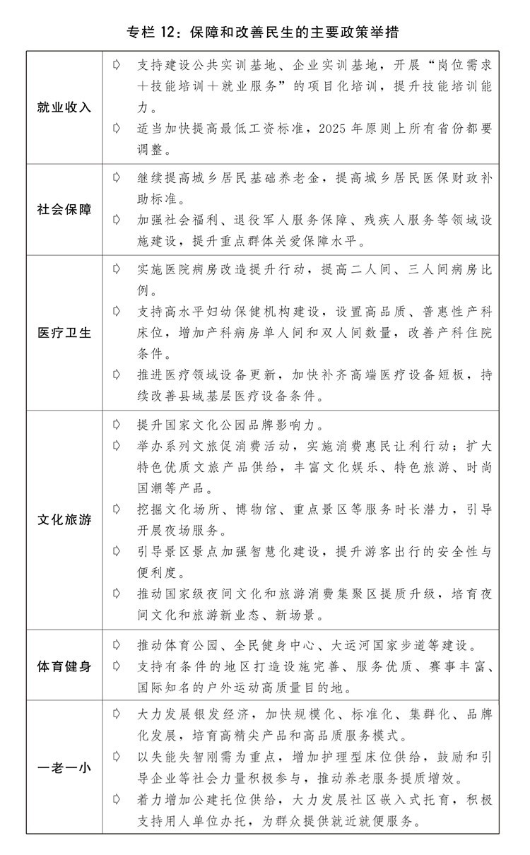 一是實(shí)施提振消費(fèi)專項(xiàng)行動(dòng)。制定提升消費(fèi)能力、增加優(yōu)質(zhì)供給、改善消費(fèi)環(huán)境政策舉措,穩(wěn)定大宗消費(fèi)、擴(kuò)大服務(wù)消費(fèi)、拓展新型消費(fèi)、合理增加公共消費(fèi),推動(dòng)消費(fèi)提質(zhì)升級(jí)。多渠道促進(jìn)居民增收,推動(dòng)中低收入群體增收減負(fù),完善勞動(dòng)者工資正常增長機(jī)制。因城施策調(diào)減房地產(chǎn)消費(fèi)限制性措施,推動(dòng)建設(shè)安全、舒適、綠色、智慧的“好房子”,更好滿足人民群眾剛性和改善性住房需求、高品質(zhì)居住需要。進(jìn)一步優(yōu)化汽車限購管理政策,加快構(gòu)建充電基礎(chǔ)設(shè)施體系,開展汽車流通消費(fèi)改革試點(diǎn)。加快拓展文化、旅游、體育、健康、養(yǎng)老、托幼、家政、數(shù)字等服務(wù)消費(fèi),實(shí)施服務(wù)消費(fèi)提質(zhì)惠民活動(dòng)、“百城百區(qū)”文化和旅游消費(fèi)行動(dòng)計(jì)劃。加快培育帶動(dòng)性廣、顯示度高的消費(fèi)新場景,支持影視游戲創(chuàng)作與中華優(yōu)秀傳統(tǒng)文化、特色旅游資源相結(jié)合等融合式沉浸式消費(fèi)新場景發(fā)展。積極發(fā)展首發(fā)經(jīng)濟(jì)、冰雪經(jīng)濟(jì)、銀發(fā)經(jīng)濟(jì)。完善游艇、房車露營等新型消費(fèi)領(lǐng)域管理機(jī)制和行業(yè)標(biāo)準(zhǔn),促進(jìn)“人工智能+消費(fèi)”,優(yōu)化消費(fèi)新業(yè)態(tài)新領(lǐng)域市場準(zhǔn)入環(huán)境,加快推動(dòng)各類新技術(shù)應(yīng)用推廣并向消費(fèi)級(jí)產(chǎn)品轉(zhuǎn)化。清理對(duì)消費(fèi)的不合理限制。深入實(shí)施優(yōu)化消費(fèi)環(huán)境三年行動(dòng),加強(qiáng)消費(fèi)信用體系和質(zhì)量標(biāo)準(zhǔn)體系建設(shè),規(guī)范網(wǎng)絡(luò)銷售、直播帶貨領(lǐng)域不合理經(jīng)營行為,強(qiáng)化消費(fèi)者權(quán)益保護(hù)。落實(shí)和優(yōu)化帶薪年休假制度。完善外國人入境居留政策和免稅店政策,推動(dòng)擴(kuò)大入境消費(fèi)。深化國際消費(fèi)中心城市建設(shè)。