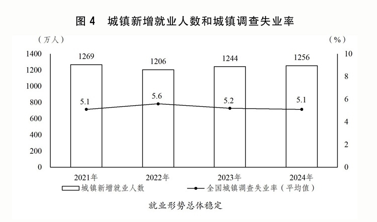 一是穩(wěn)就業(yè)促增收取得積極成效。出臺(tái)實(shí)施就業(yè)優(yōu)先戰(zhàn)略促進(jìn)高質(zhì)量充分就業(yè)的意見。延續(xù)實(shí)施失業(yè)保險(xiǎn)援企穩(wěn)崗政策,優(yōu)化整合吸納就業(yè)補(bǔ)貼和擴(kuò)崗補(bǔ)助。強(qiáng)化高校畢業(yè)生、脫貧人口、農(nóng)民工以及就業(yè)困難人員等就業(yè)幫扶。實(shí)施高校畢業(yè)生等青年就業(yè)服務(wù)攻堅(jiān)行動(dòng)、先進(jìn)制造業(yè)促就業(yè)行動(dòng)和百萬就業(yè)見習(xí)崗位募集計(jì)劃,構(gòu)建高校畢業(yè)生高質(zhì)量就業(yè)服務(wù)體系。加大力度支持公共實(shí)訓(xùn)基地建設(shè),持續(xù)做好重點(diǎn)人群技能培訓(xùn)。做好退役軍人就業(yè)服務(wù)保障,提高優(yōu)撫補(bǔ)助標(biāo)準(zhǔn)。城鎮(zhèn)新增就業(yè)1256萬人,城鎮(zhèn)調(diào)查失業(yè)率平均為5.1%。全國居民人均可支配收入實(shí)際增長5.1%。城鄉(xiāng)居民人均可支配收入比為2.34,城鄉(xiāng)居民收入相對(duì)差距繼續(xù)縮小。指導(dǎo)地方上調(diào)最低工資標(biāo)準(zhǔn)。向困難群眾發(fā)放一次性生活補(bǔ)助,惠及1100多萬人。