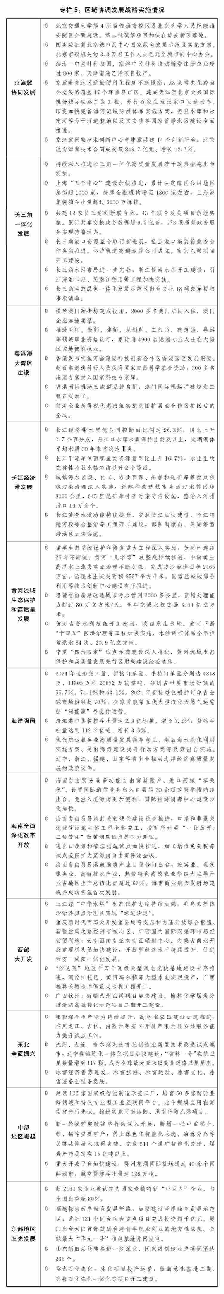 一是區(qū)域協(xié)調(diào)發(fā)展積厚成勢。京津冀協(xié)同發(fā)展走深走實(shí),在京相關(guān)高校、醫(yī)院、中央企業(yè)總部及二三級(jí)子公司分批向雄安新區(qū)疏解,北京城市副中心行政辦公、商務(wù)服務(wù)、文化旅游等功能不斷完善,進(jìn)一步支持天津?yàn)I海新區(qū)高質(zhì)量發(fā)展若干政策措施出臺(tái)實(shí)施,三省市互聯(lián)互通交通網(wǎng)絡(luò)更加完善、產(chǎn)業(yè)鏈上下游協(xié)作持續(xù)強(qiáng)化、公共服務(wù)共建共享水平進(jìn)一步提升。長三角一體化高質(zhì)量發(fā)展深入推進(jìn),生態(tài)綠色一體化發(fā)展示范區(qū)改革授權(quán)壓茬推進(jìn),港口資源整合、軌道互聯(lián)互通等取得新進(jìn)展,上?!拔鍌€(gè)中心”建設(shè)進(jìn)一步加快。粵港澳大灣區(qū)建設(shè)邁上新臺(tái)階,橫琴粵澳深度合作區(qū)封關(guān)“一線”“二線”分線管理運(yùn)行順利,超1.6萬名澳門居民在合作區(qū)居住生活,支持河套深港科技創(chuàng)新合作區(qū)深圳園區(qū)、香港園區(qū)聯(lián)動(dòng)發(fā)展,創(chuàng)新要素跨境流動(dòng)更加便捷。長江經(jīng)濟(jì)帶共抓大保護(hù)、不搞大開發(fā)成效顯著,進(jìn)一步抓實(shí)抓好長江大保護(hù)工作三年行動(dòng)計(jì)劃出臺(tái)實(shí)施,長江十年禁漁取得明顯成效,長江干流連續(xù)5年保持Ⅱ類水質(zhì),綜合立體交通走廊加快構(gòu)建,沿江高鐵全線開工建設(shè)。黃河流域生態(tài)保護(hù)和高質(zhì)量發(fā)展邁出堅(jiān)實(shí)步伐,農(nóng)業(yè)面源、城鎮(zhèn)生活、工業(yè)和尾礦庫污染治理深入推進(jìn),8萬余個(gè)入河排污口開展溯源整治,一批生態(tài)保護(hù)修復(fù)重點(diǎn)項(xiàng)目加快建設(shè),黃河干流連續(xù)3年保持Ⅱ類水質(zhì)。海洋強(qiáng)國建設(shè)深入推進(jìn),海洋強(qiáng)省、現(xiàn)代海洋城市、全國海洋經(jīng)濟(jì)發(fā)展示范區(qū)創(chuàng)新發(fā)展,海洋生態(tài)環(huán)境質(zhì)量持續(xù)改善,海洋生產(chǎn)總值超10萬億元。