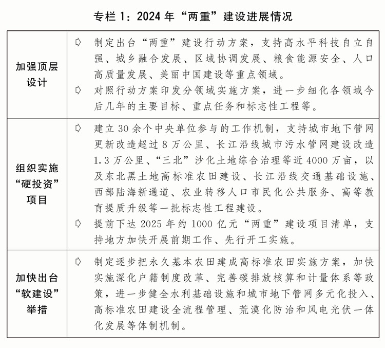 三是加力推進(jìn)“兩重”建設(shè)。進(jìn)一步完善自上而下的工作機(jī)制,加強(qiáng)“兩重”建設(shè)項(xiàng)目儲(chǔ)備,更好統(tǒng)籌“硬投資”與“軟建設(shè)”。安排超長期特別國債8000億元支持“兩重”建設(shè),進(jìn)一步優(yōu)化具體投向并提高項(xiàng)目支持比例,重點(diǎn)支持基礎(chǔ)研究能力提升、未來產(chǎn)業(yè)發(fā)展、東北等重點(diǎn)地區(qū)高標(biāo)準(zhǔn)農(nóng)田建設(shè)、大中型灌區(qū)新建改造及大中型引調(diào)水和大中型水庫建設(shè)、長江經(jīng)濟(jì)帶生態(tài)環(huán)境保護(hù)和綠色發(fā)展、農(nóng)業(yè)轉(zhuǎn)移人口市民化公共服務(wù)體系建設(shè)、高等教育提質(zhì)升級(jí)、城市地下管網(wǎng)管廊建設(shè)改造等方面任務(wù),強(qiáng)化超長期貸款等配套融資,高質(zhì)量推進(jìn)“硬投資”項(xiàng)目謀劃實(shí)施。加大力度推動(dòng)“軟建設(shè)”政策落地見效。