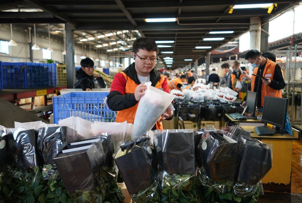 2022年11月11日,工作人員在昆明斗南花市給鮮花貼標(biāo)簽??爝f物流時效不斷優(yōu)化、冷鏈運(yùn)輸技術(shù)持續(xù)提升,也為中國鮮花加速“出?!北q{護(hù)航。
