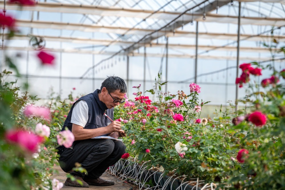 2023年10月20日,在云南省安寧市現(xiàn)代農(nóng)業(yè)園區(qū)玫瑰種植示范園,技術(shù)員田連通在記錄太空育種玫瑰花編號。