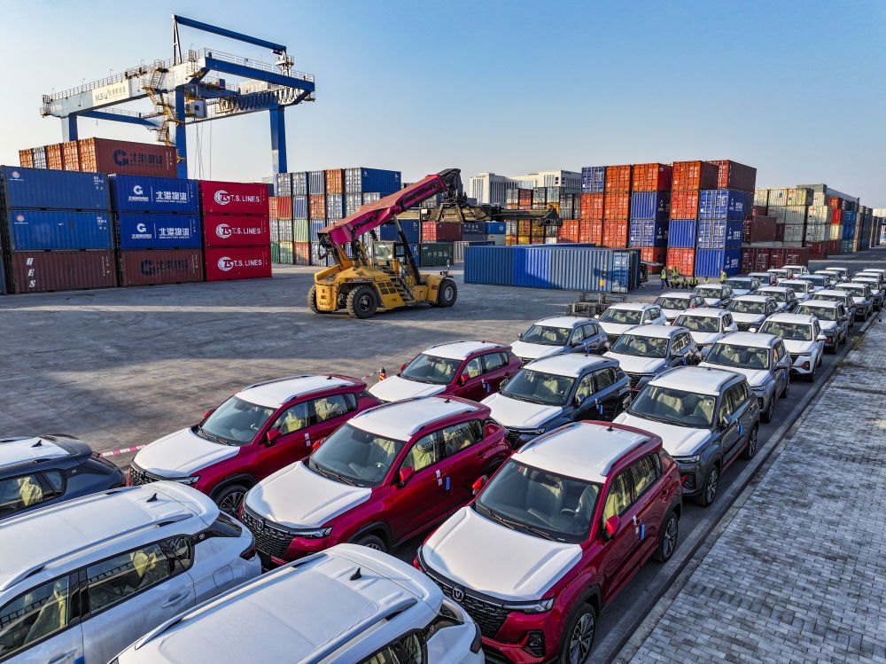 2024年10月28日在重慶國際物流樞紐園區(qū)西部陸海新通道重慶無水港拍攝的出口汽車裝運(yùn)現(xiàn)場(無人機(jī)照片)。位于重慶市沙坪壩區(qū)的重慶國際物流樞紐園區(qū),是重慶中歐班列、西部陸海新通道班列、渝滿俄班列、渝甬班列的主要到發(fā)點(diǎn),截至2024年10月,已開通班列線路62條,輻射125個(gè)國家和地區(qū)的542個(gè)港口。