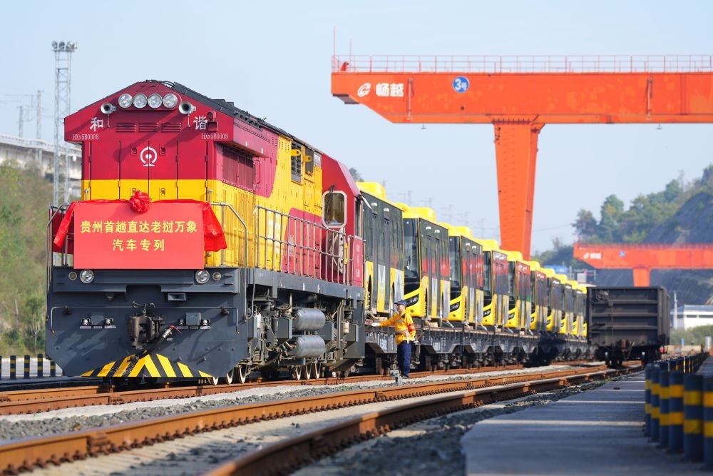 2024年10月28日,裝載著28輛“貴州造”新能源客車的出口專列??吭谫F陽國際陸港都拉營站,準(zhǔn)備經(jīng)由云南磨憨口岸出境前往老撾萬象。這是貴州的中老班列首次整列直發(fā),也是貴州本土生產(chǎn)的新能源客車首次出口老撾。