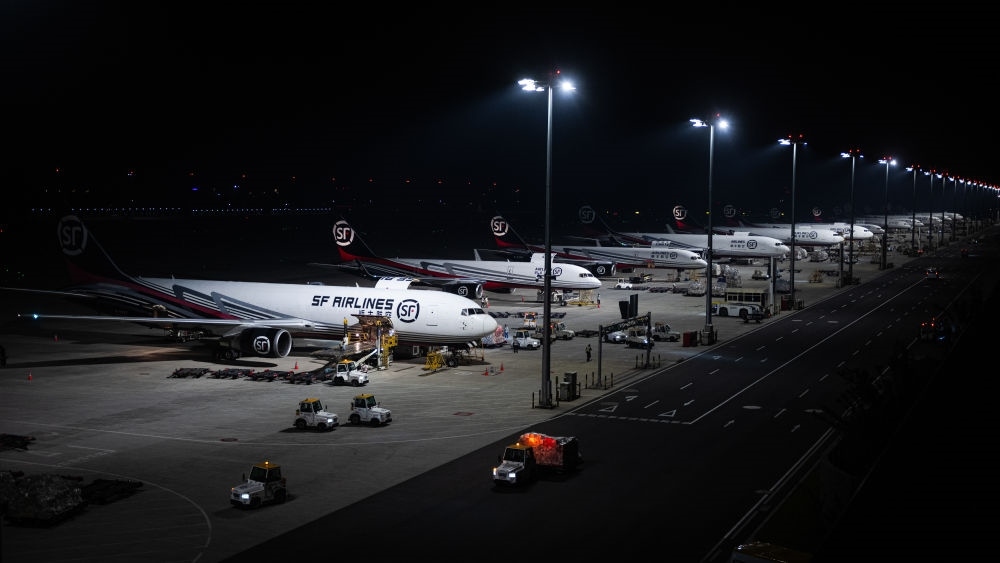 2024年5月25日凌晨,工人在湖北鄂州花湖國際機(jī)場停機(jī)坪裝卸貨物。鄂州花湖國際機(jī)場于2022年7月建成投運(yùn),是亞洲首個(gè)專業(yè)貨運(yùn)樞紐機(jī)場。截至2025年1月26日,鄂州花湖國際機(jī)場已開通37條國際貨運(yùn)航線和66條國內(nèi)貨運(yùn)航線。