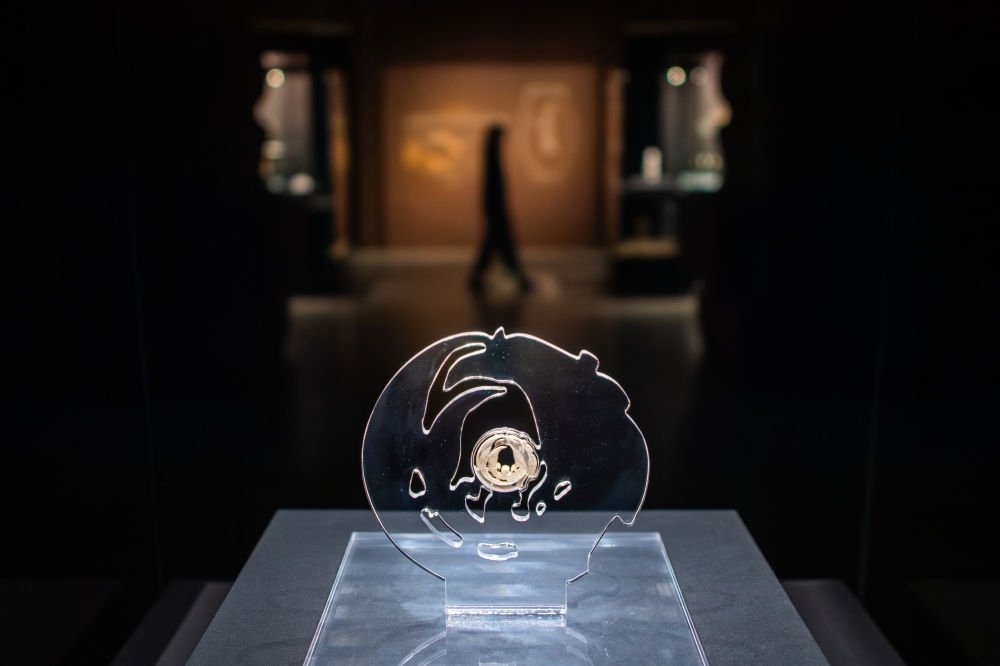 在武漢盤龍城遺址博物院拍攝的玉團鳳(2024年3月30日攝)。1955年,玉團鳳于湖北天門石家河遺址出土,造型秀美,線條遒勁流暢,被譽為“中華第一鳳”。石家河遺址距今約5000年,是長江中游同期規(guī)模最大的聚落。