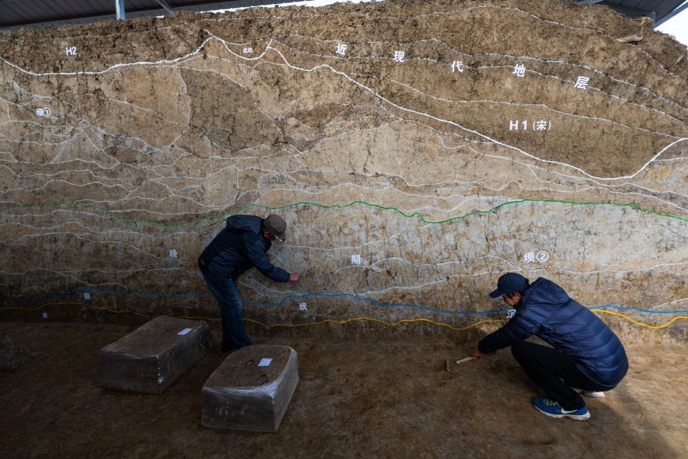 2023年12月4日,考古人員在湖北荊門屈家?guī)X遺址熊家?guī)X水壩現場工作。屈家?guī)X遺址是屈家?guī)X文化的發(fā)現地和命名地,地處大洪山南麓向江漢平原的過渡地帶,是實證長江中游文明起源的重要大遺址。