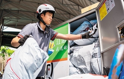 江蘇省南通市通州區(qū)川姜鎮(zhèn),快遞員在整理待派送的快遞。