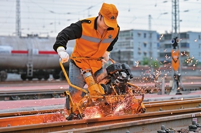 國鐵鄭州局新鄉(xiāng)橋工段職工在檢查整修鐵路道岔設(shè)備。
