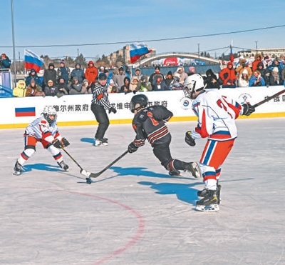 2月22日至23日,2025中俄國際冬季體育系列比賽在中國黑河市和俄羅斯布拉戈維申斯克市之間的黑龍江江面上舉行。圖為中俄少年組冰球隊(duì)員在賽場(chǎng)上激烈角逐。