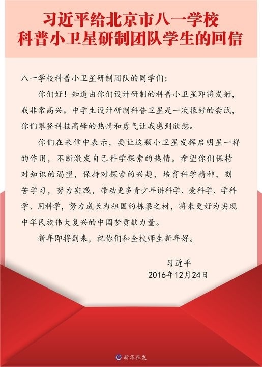 三個(gè)多月后,同學(xué)們給習(xí)近平總書(shū)記寫(xiě)信,報(bào)告小衛(wèi)星即將發(fā)射的消息,很快收到了總書(shū)記的回信。習(xí)近平總書(shū)記在回信中說(shuō),“你們攀登科技高峰的熱情和勇氣讓我感到欣慰”“希望你們保持對(duì)知識(shí)的渴望,保持對(duì)探索的興趣,培育科學(xué)精神,刻苦學(xué)習(xí),努力實(shí)踐,帶動(dòng)更多青少年講科學(xué)、愛(ài)科學(xué)、學(xué)科學(xué)、用科學(xué),努力成長(zhǎng)為祖國(guó)的棟梁之材”。