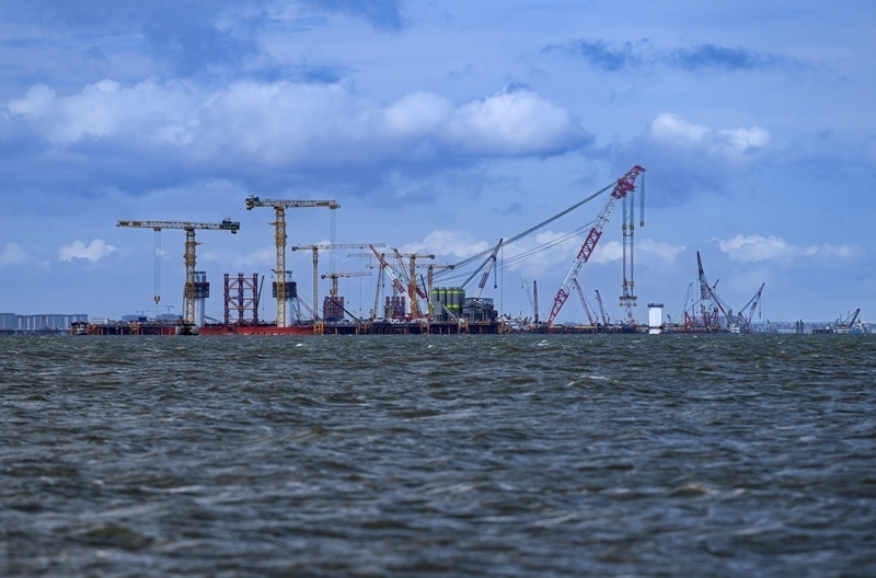 這是廈金大橋(廈門段)海上橋梁大規(guī)模裝配化施工現(xiàn)場(chǎng)(無人機(jī)照片,6月13日攝)。