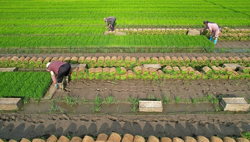 6月19日,在江蘇省連云港市東??h張灣鄉(xiāng)張灣村秧板田里,農(nóng)民起水稻秧苗準(zhǔn)備進(jìn)行機(jī)插作業(yè)(無人機(jī)照片)。