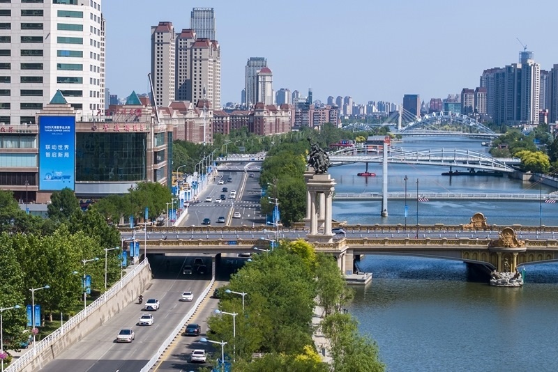 天津市南開區(qū)的一處人行天橋上懸掛著2025夏季達(dá)沃斯論壇宣傳標(biāo)語(6月21日攝,無人機(jī)照片)。