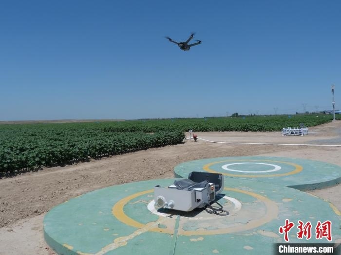 6月28日,新疆石河子市一片棉田中,遙感監(jiān)測作物長勢的無人機巡檢返回?!≮w婧姝 攝