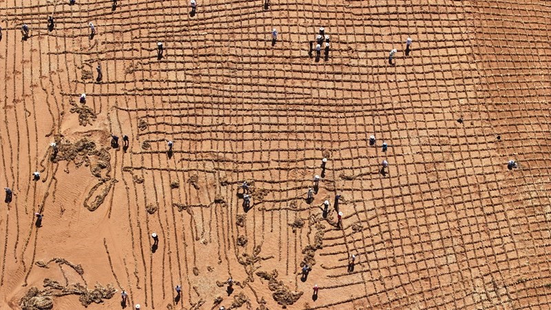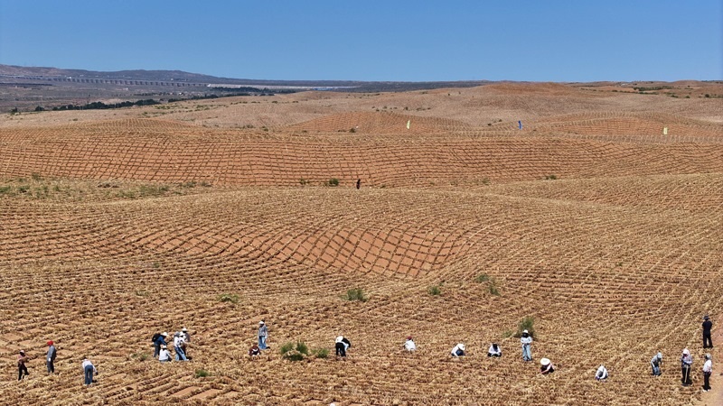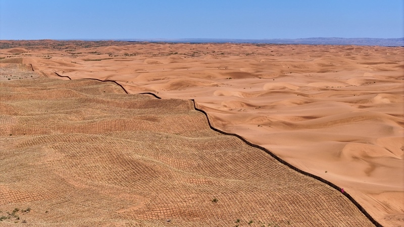 6月30日,在位于寧夏中衛(wèi)市長(zhǎng)流水村的騰格里沙漠東南緣,隨著治沙工人將最后一列草方格穩(wěn)穩(wěn)扎下,這項(xiàng)跨越半個(gè)世紀(jì)的治沙工程,在騰格里沙漠寧夏境內(nèi)實(shí)現(xiàn)全面“鎖定”。一條長(zhǎng)153公里、最寬處達(dá)38公里的固沙鎖邊帶蜿蜒開(kāi)來(lái)。