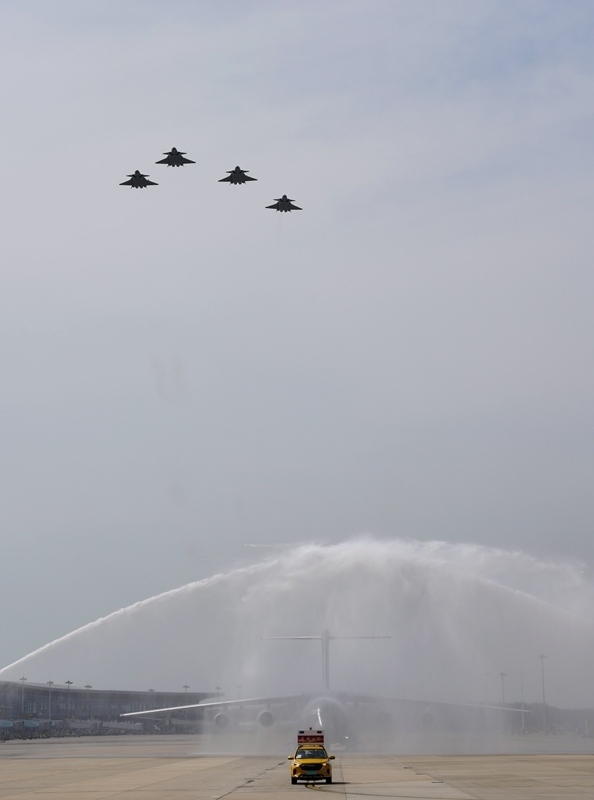 9月12日,第十二批在韓中國人民志愿軍烈士遺骸回國。這是在沈陽桃仙國際機(jī)場,接運(yùn)烈士遺骸回國的運(yùn)-20專機(jī)通過水門。
