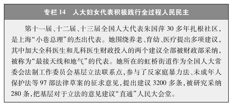通過(guò)人民代表大會(huì)行使國(guó)家權(quán)力。人大代表中婦女代表比例不斷提升。2023年第十四屆全國(guó)人大婦女代表790人,占26.5%,比第十二屆、十三屆分別提高3.1個(gè)、1.6個(gè)百分點(diǎn);全國(guó)縣、鄉(xiāng)兩級(jí)人大婦女代表比例分別為31.64%、32.36%。人大婦女代表依法履職盡責(zé),聽取和反映婦女群眾和各方意見建議。2018-2025年,全國(guó)人大婦女代表提出建議、批評(píng)和意見共29328件,占建議總數(shù)的42.3%。