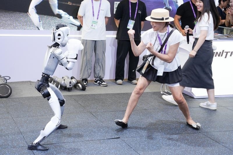 2025年9月19日,在廣西南寧國際會(huì)展中心人工智能專館,一臺人形機(jī)器人和觀眾表演拳擊。新華社記者 周汀鷺 攝