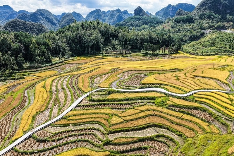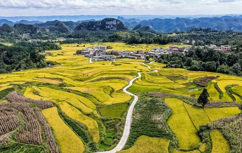 長順縣長寨街道擺塘梯田風(fēng)光(9月17日攝,無人機(jī)照片)。