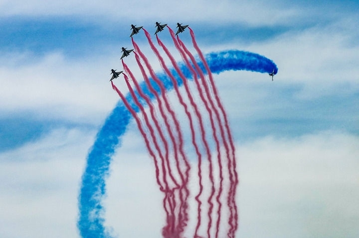 10時許,空軍航空大學“紅鷹”飛行表演隊采取雙四機超密集編隊起飛,拉開飛行表演序幕。8架紅白藍涂裝的教-8飛機完成機群集合后,以經(jīng)典的“紅鷹”編隊動作通場,八機鉆石斤斗、六機快滾、雙機點贊、單機盤旋繞軸、七機開花等19個動作高水平呈現(xiàn)。