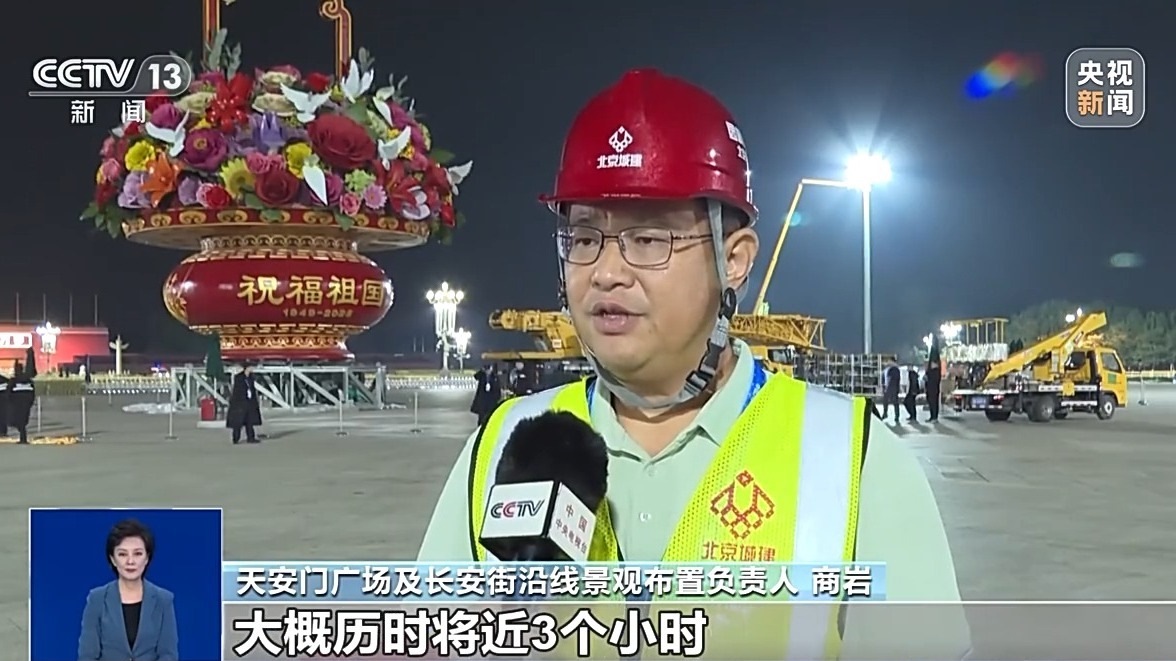 天安門廣場及長安街沿線景觀布置負責人 商巖:從吊裝準備工作開始,一直到吊裝完成,大概歷時將近3個小時。保證籃盤和籃體的緊密結合,因為花籃在插置的過程中有一個觀賞角度,所以在吊裝和合龍整個過程當中,四面相應的觀賞面都要有工作人員要盯著,這個面不能有任何的變化。
