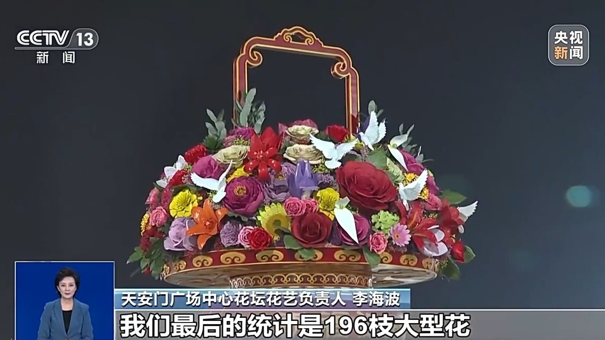 總臺記者 魏雨彤:今年的“祝福祖國”花籃籃體高16米,籃內選取了18種美好寓意的花卉,比如說月季,首次作為焦點花寓意和平希望,向日葵寓意自由幸福。值得一提的是,今年還首次將靈動的動物元素融入其中,10只和平鴿正以三種不同的姿態(tài)翱翔于花籃之上,成為今年的新亮點。