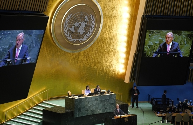 9月22日,在位于紐約的聯(lián)合國總部,聯(lián)合國秘書長古特雷斯在紀念北京世婦會30周年高級別會議上講話。