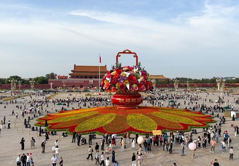 9月25日,2025年“祝福祖國(guó)”巨型花籃正式完工,亮相天安門(mén)廣場(chǎng)與市民共度佳節(jié)。今年“祝福祖國(guó)”花壇以喜慶的花籃為主景,花壇頂高18米,籃體高16米,籃盤(pán)直徑12米?;@體南側(cè)書(shū)寫(xiě)“祝福祖國(guó)”“1949-2025”字樣,籃體北側(cè)書(shū)寫(xiě)“歡度國(guó)慶”“1949-2025”字樣。籃內(nèi)選取了美好寓意的花卉,其中荷花寓意“和和美美”、橄欖枝寓意“榮耀和平”等,還結(jié)合和平鴿元素,體現(xiàn)“和平發(fā)展、欣欣向榮”。