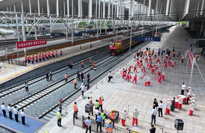 7月1日在延安站拍攝的西延高鐵軌道貫通儀式(無人機照片)。