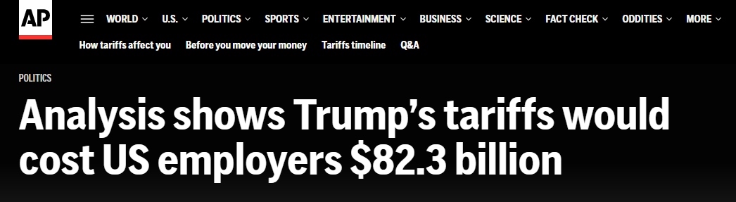 4月份,特朗普政府宣布所謂“對等關稅”政策后,金融市場出現(xiàn)恐慌。隨后,又設定了90天談判期,期間多數(shù)進口商品面臨10%基準稅率。報道稱,若4月2日的初始關稅維持不變,研究中所涉及的企業(yè)將承受更為高昂的1876億美元的額外成本。若按照現(xiàn)行稅率,823億美元成本平均到每位員工身上就是2080美元,相當于年均薪資的3.1%。這一平均值涵蓋了無進口業(yè)務與有進口業(yè)務企業(yè)。