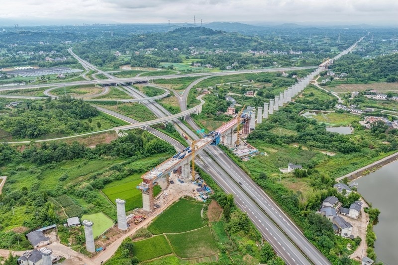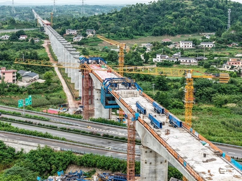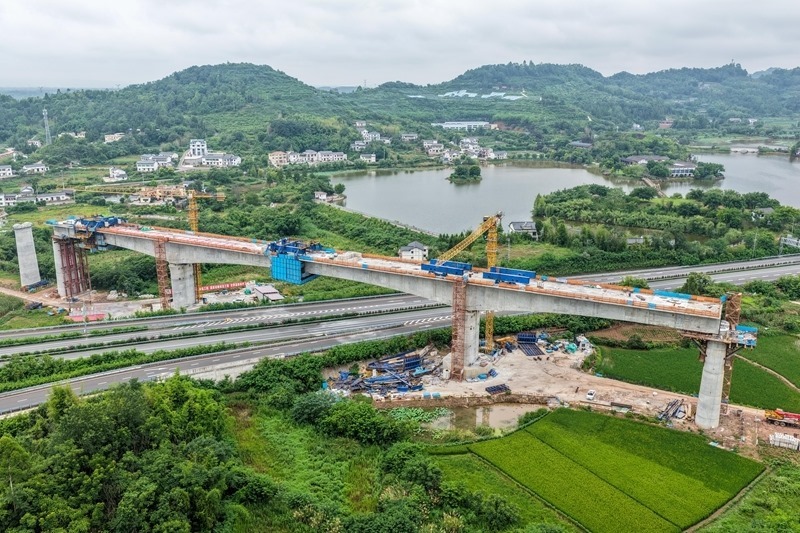 這是7月8日拍攝的成渝中線高鐵土橋樞紐互通雙線特大橋建設現(xiàn)場(無人機照片)。