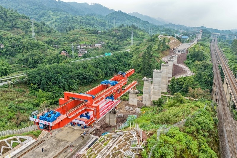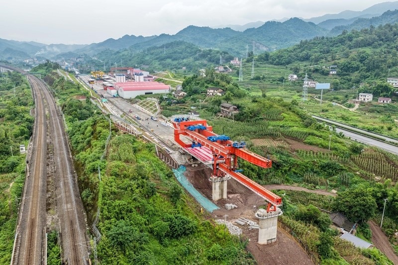 當日,中鐵十四局工人將首孔長24.6米、重542噸的箱梁架設在西渝高鐵重慶段陳家溝特大橋第一孔橋墩上,標志著西渝高鐵重慶段箱梁架設施工正式啟動。