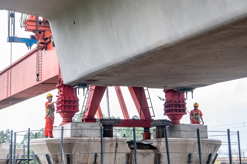 7月10日,在西渝高鐵陳家溝特大橋建設現(xiàn)場,架梁機在工人的指揮下進行首孔箱梁架設作業(yè)。
