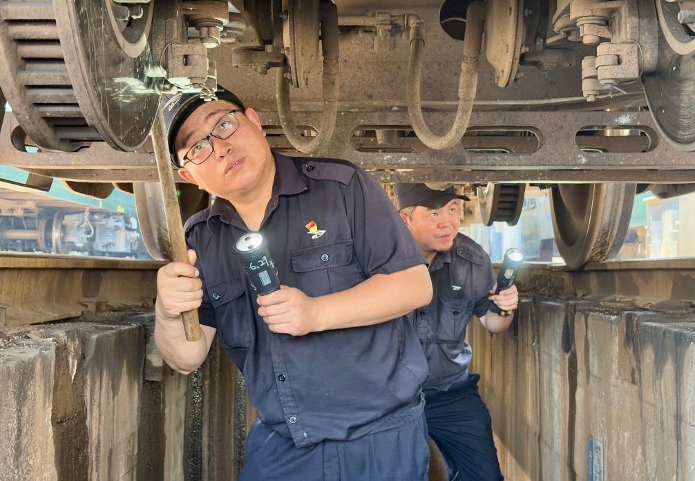 只見他俯下身鉆入車底,仔細檢查車輛的轉(zhuǎn)向架、制動裝置等關(guān)鍵部位。車底空間狹小、光線不足,許立業(yè)需借助手電筒弓著腰作業(yè),不一會兒,汗水就浸濕了工作服。為了預防中暑,他掏出一瓶藿香正氣水,一口氣喝完,然后擦了擦臉上的汗水,繼續(xù)朝下節(jié)車廂走去。