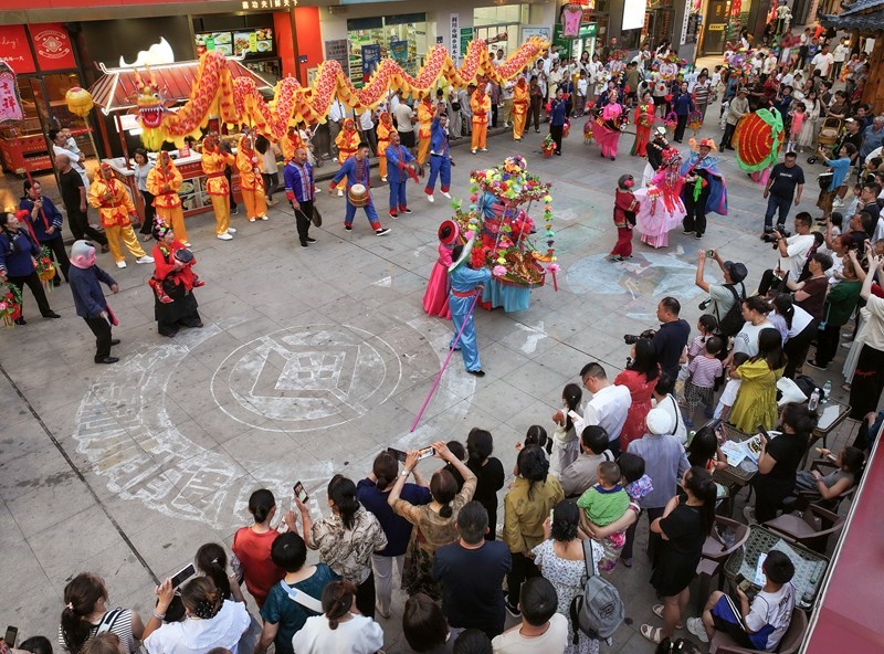 7月10日,民間藝人在利川市非遺美食街為游客表演節(jié)目(無(wú)人機(jī)照片)。