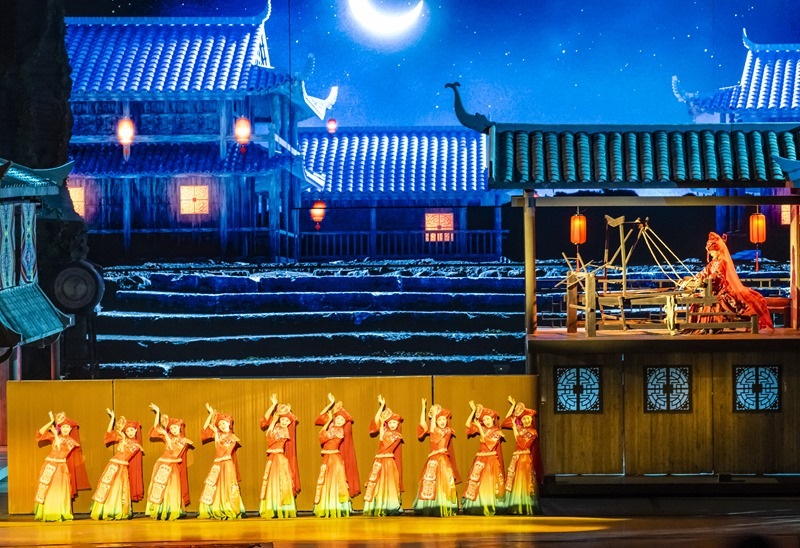7月10日,游客在利川市騰龍洞的洞穴內(nèi)觀看實(shí)景劇《夷水麗川》。