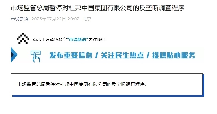 “市說新語”微信公眾號消息,市場監(jiān)管總局暫停對杜邦中國集團有限公司的反壟斷調(diào)查程序。