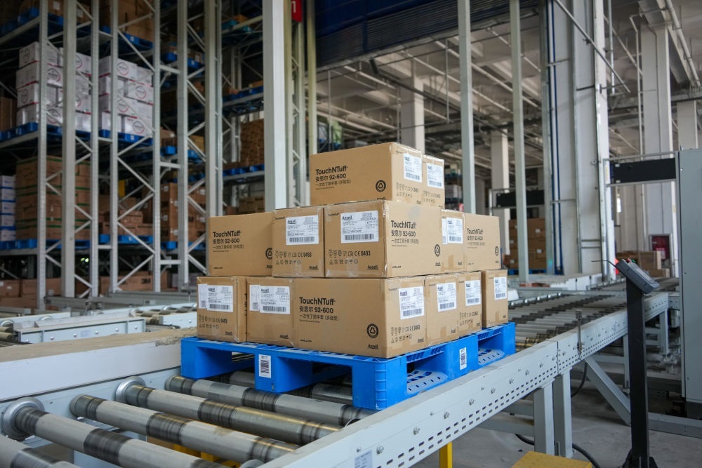 在山東臨沂的新明輝智慧倉儲物流園,貨物在傳輸帶上運輸(2025年6月11日攝)。新華社記者 徐速繪 攝
