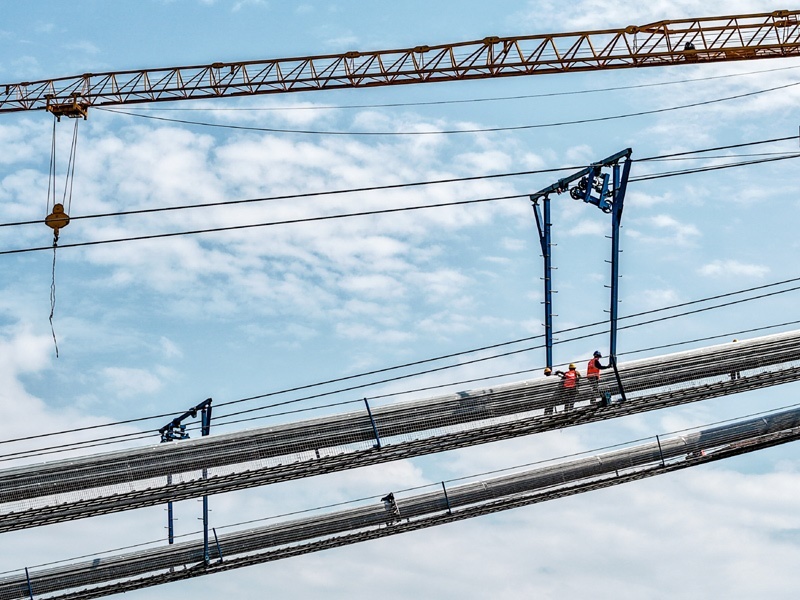 7月30日,在重慶黃桷沱長江大橋建設(shè)現(xiàn)場,工人在施工作業(yè)(無人機(jī)照片)。