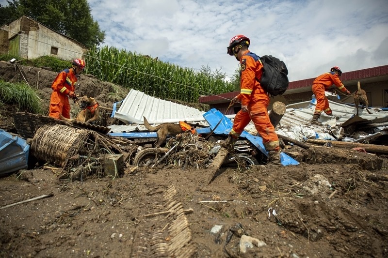 8月9日,國家西北區(qū)域應急救援中心指戰(zhàn)員在馬坡鄉(xiāng)舊莊溝村攜帶搜救犬配合大型機械搜救失聯(lián)人員。
