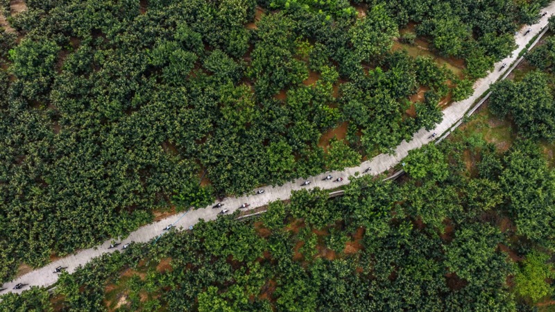 8月8日,騎行愛好者在河北省遵化市蘇家洼鎮(zhèn)二道嶺村騎行(無(wú)人機(jī)照片)。