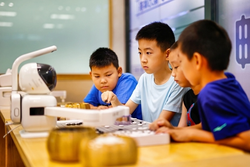8月10日,小朋友在天津?yàn)I海文化中心與機(jī)器人下圍棋。