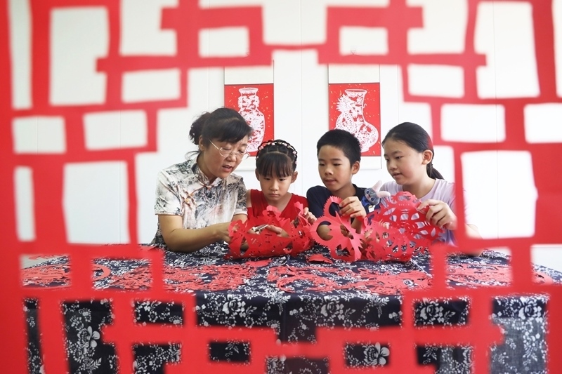 8月9日,河北省唐山市豐潤(rùn)區(qū)燕山路街道欣園社區(qū),小朋友在學(xué)習(xí)剪紙。