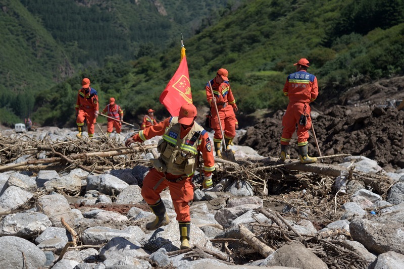 8月11日,在榆中縣馬坡鄉(xiāng)陽屲山村,蘭州市消防救援支隊(duì)救援人員開展清理搜尋工作。