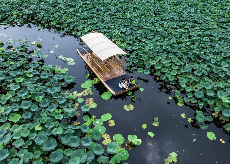 8月13日,游客在江蘇省興化市萬畝荷塘景區(qū)賞荷游玩(無人機照片)。
