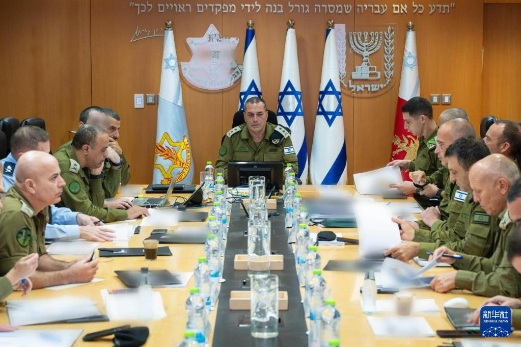 這張8月13日發(fā)布的未注明拍攝地點的照片顯示,以軍總參謀長扎米爾(中)當天舉行會議。新華社發(fā)(以色列國防軍供圖)