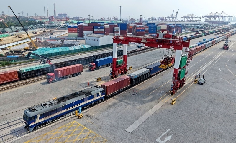 這是8月19日拍攝的山東港口青島港前灣港區(qū)海鐵聯(lián)運中心堆場(無人機照片)。